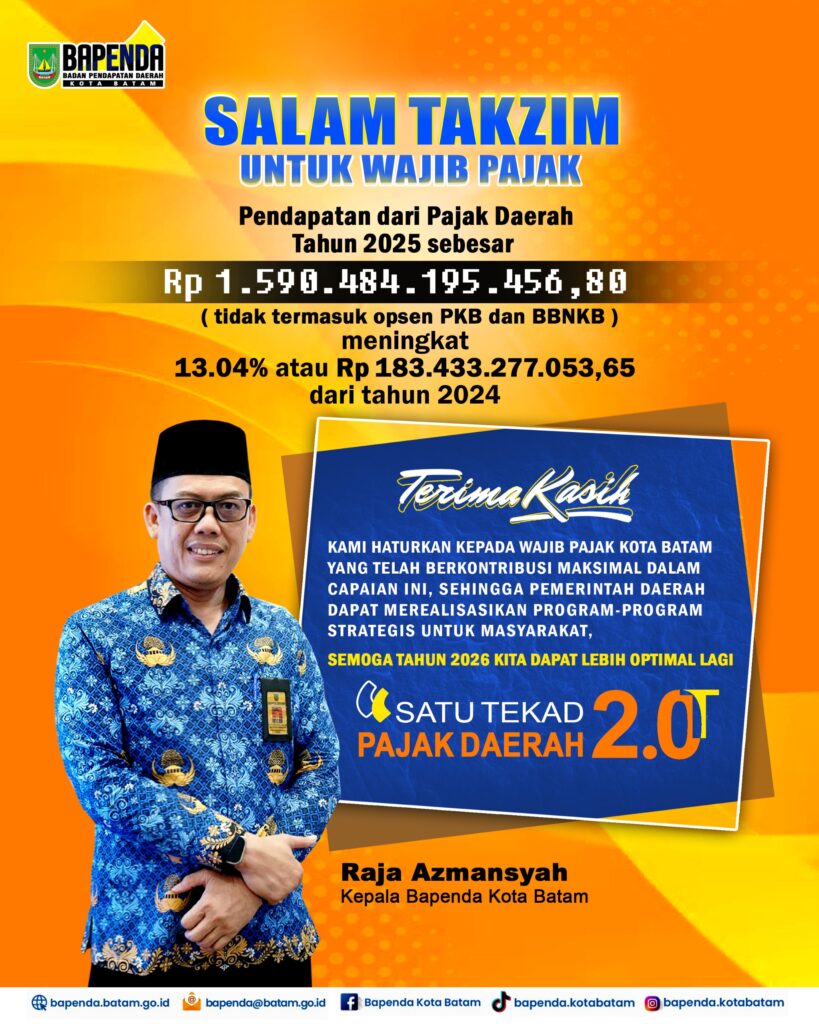 Salam Takzim Untuk Wajib Pajak9 January 2026 in Berita by bapenda Pendapatan dari Wajib Pajak Tahun 2025 SebesarRp 1.590.484.195.456,80(Tidak Termasuk Opsen PKB dan BBNKB)Meningkat13.04% atau Rp 183.433.277.053,65dari Tahun 2024 Post Views: 1